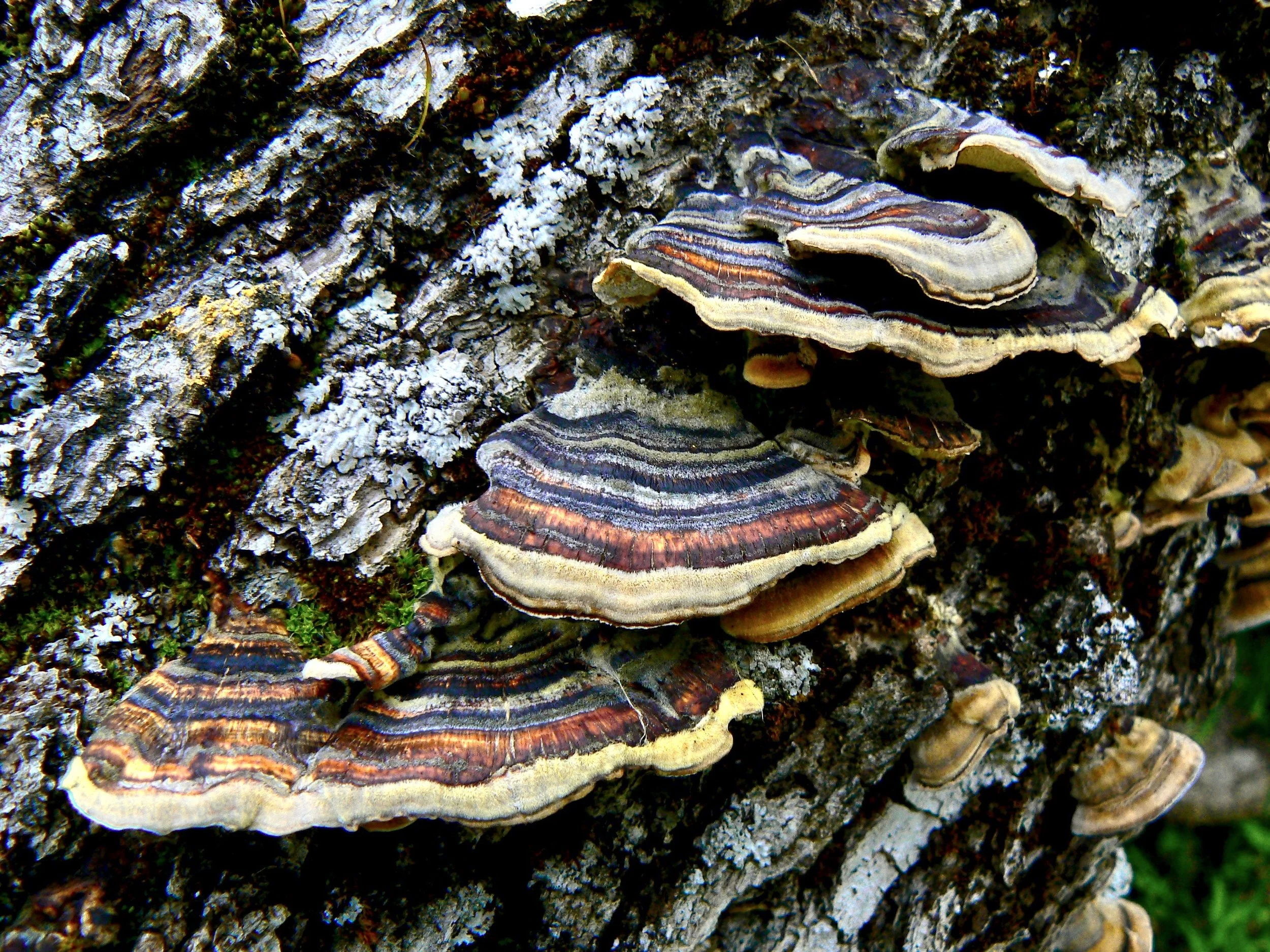 The fungal shelves that adorn tree trunks are among the most fascinating and photogenic of all – though we imagine the trees themselves take a less upbeat, aesthetically appreciative view of their partners in parasitism. The lovely (and expensive) Japanese maple in your front yard doesn’t desire disassembly by fungi. But like forest fires, fungi are nature’s way of telling a tree that it’s time to make way – in style. Those banded and multi-hued wedges spiraling up tree trunks testify, like the crimson and saffron leaves of autumn, to the terrible beauty of Earth’s rhythms.
