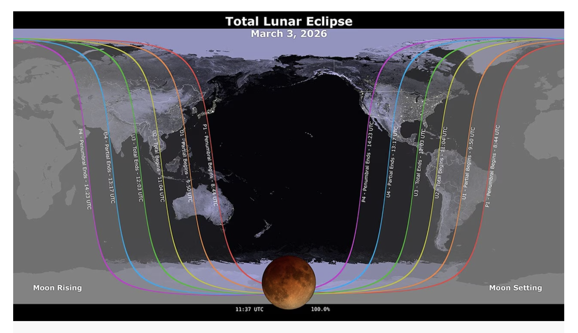 Pray for clear skies in the early hours of Tuesday, March 3, when the Western Hemisphere of planet Earth will be treated to the spectacle of a total lunar eclipse, the last before 2028. On the West Coast, Luna will begin passing into Earth’s penumbra at 12:44 a.m. and into totality by 3:04 a.m.. By 3:33 a.m., totality reaches maximum. But night owls can watch the entire pageant unwind till 5:17 a.m.