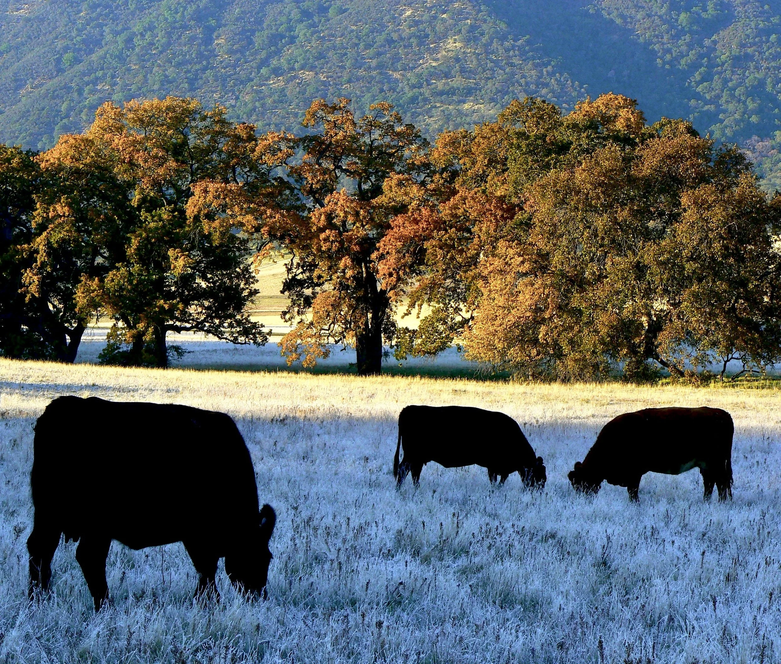 Cattle crop frosty grass on an autumn morning in Murphy Meadow.