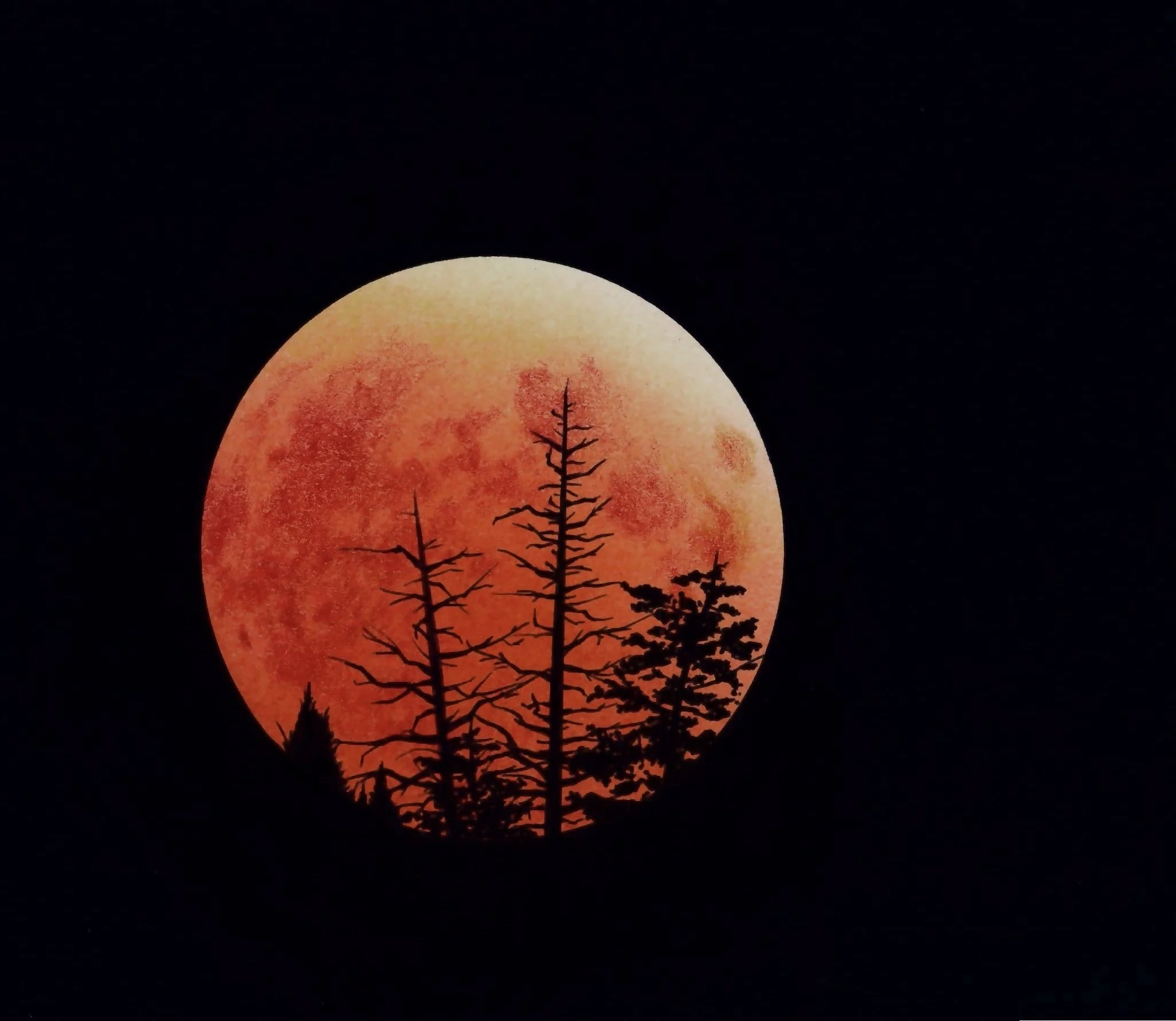 In the course of hundreds of solo night hikes guided by moonlight, I’ve seen Luna in myriad moods from myriad angles: the slenderest of crescents suspended featherlike in the delicate updraft of dawn, or as fragments of pale gold flashing through gaps in trees as I stride through the forest. I’ve seen her as a pearl glowing from the Milky Way’s river bed as clouds flow past her like leaves caught by the current. And I’ve seen her in eclipse, an angry queen robed in red, majestic and terrible.